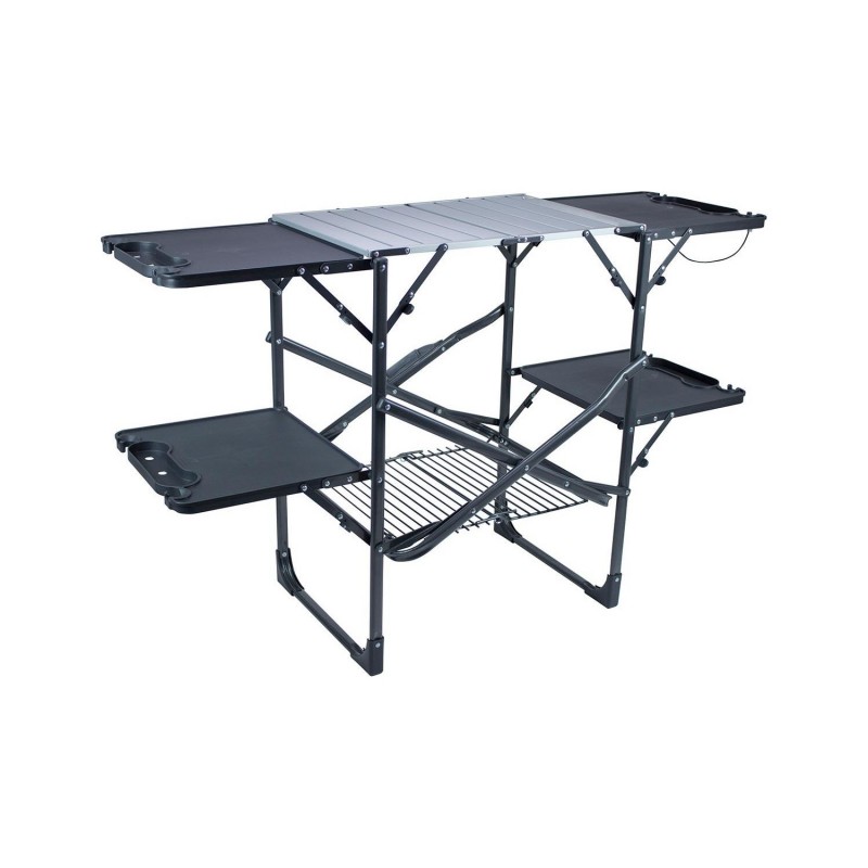 Dayanıklılığı ve kalitesi ile markalaşmış GCI Outdoor Slim-Fold Katlanır Pişirme Kamp Masası modeli ile sizlerle.Alüminyum malzemeden üretilmiş olup hafif ve dayanıklıdır.Patentli Slim-Fold Teknolojisi ile az yer kaplar ve taşıması kolaydır.Isıya dayanıklı 22 kg alüminyum tezgahı sayesinde ocaklarınızı üstüne koyabilirsiniz.Dört adet katlanır yan raflar.Dayanıklı ve sağlam yan rafların 12 kg taşıma kapasitesi vardır. Kullanmadığınız rafları kapatıp yer kaplamasını engellersiniz.Sakalama alanı olarak kullanabileceğiniz 16 kg taşıma kapasiteli alt raf mevcuttur.Rafların dayanıklılığı sağlamak için özel kilit mekanizması mevcuttr.Dahili taşıma kolu ile rahatlıkla yanınızda taşıyabilirsiniz.Görselde kullanılan ürünler teşhir amaçlıdır ürün ile birlikte satılmaz.